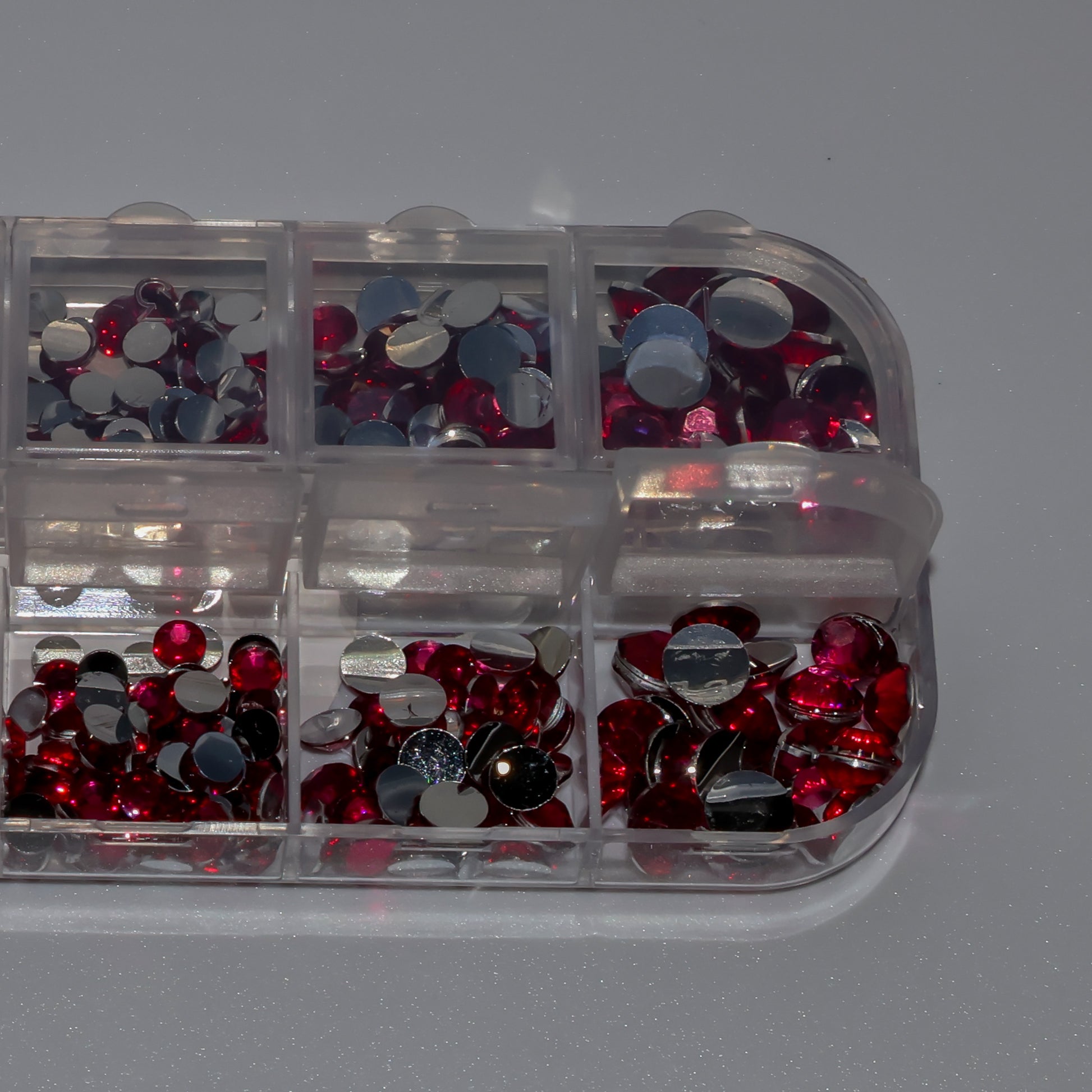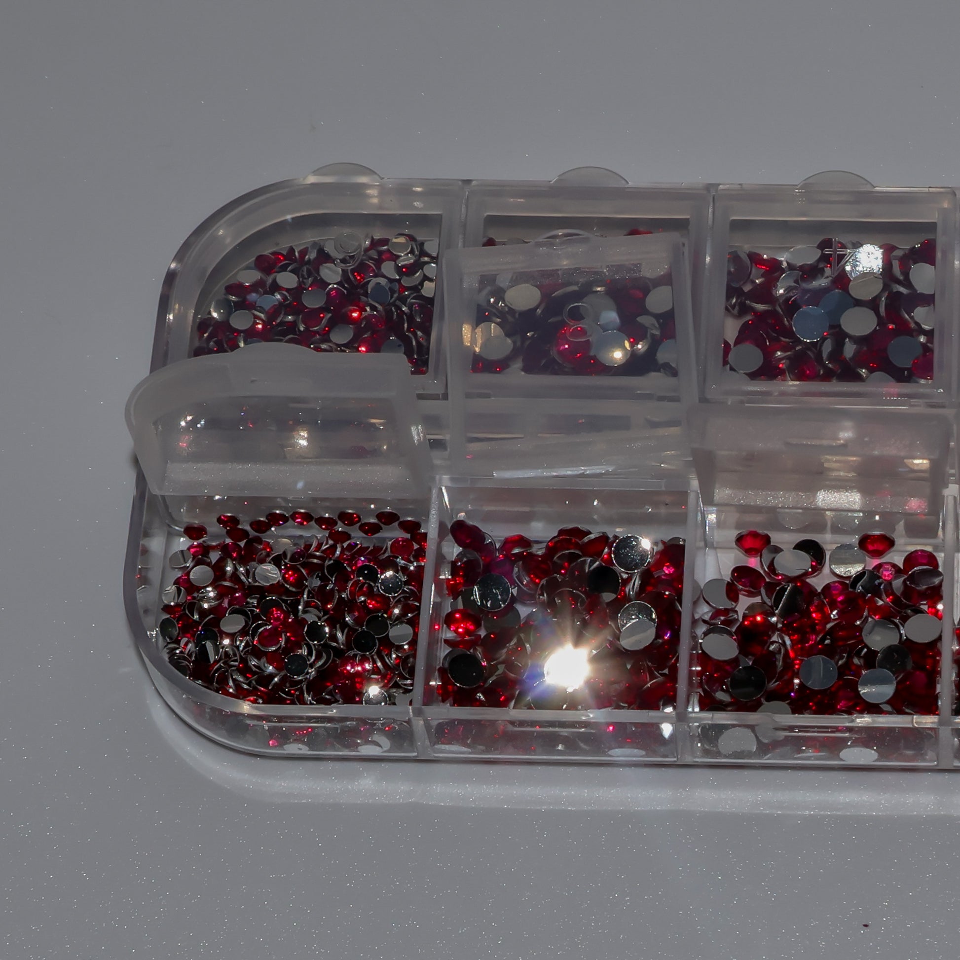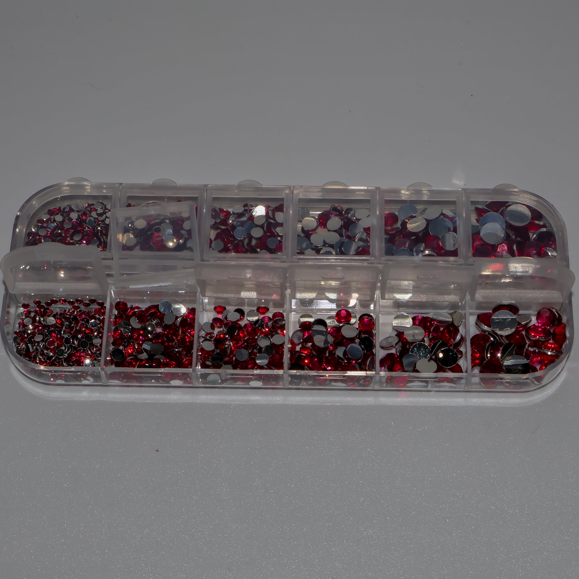 Paquete completo con 14 filas. Diferentes tamaños. Parte trasera plana y redonda. Cristal de calidad (no Swarovski).